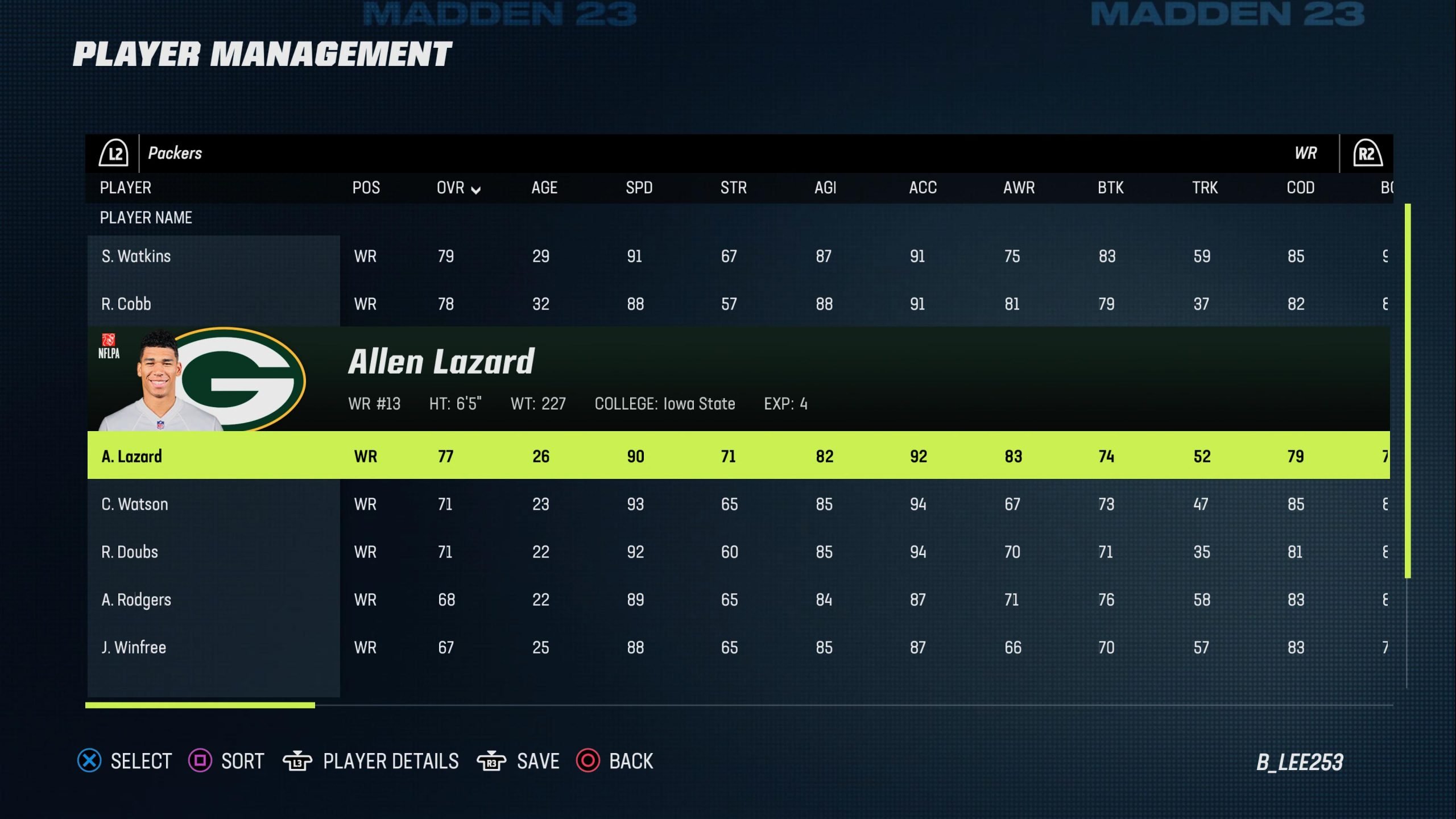 Allen Lazard(77 OVR)와 함께 스타의 이탈로 인해 다시 브레이크아웃으로 돌아왔습니다. Lazard와 Green Bay의 경우 오프시즌 동안 99 Club의 Davante Adams를 라스베거스에게 잃은 것입니다. Sammy Watkins(79 OVR)와 Randall Cobb(78 OVR)는 깊이 차트에서 Lazard보다 앞서 있지만(간신히), Lazard와 같이 전성기보다 경력 끝에 더 가깝습니다. Aaron Rodgers는 장수하기 때문에 Cobb에 의존할 수 있지만 Lazard는 Rodgers와 Packers에게 새로운 큰 위협이 될 태세입니다.