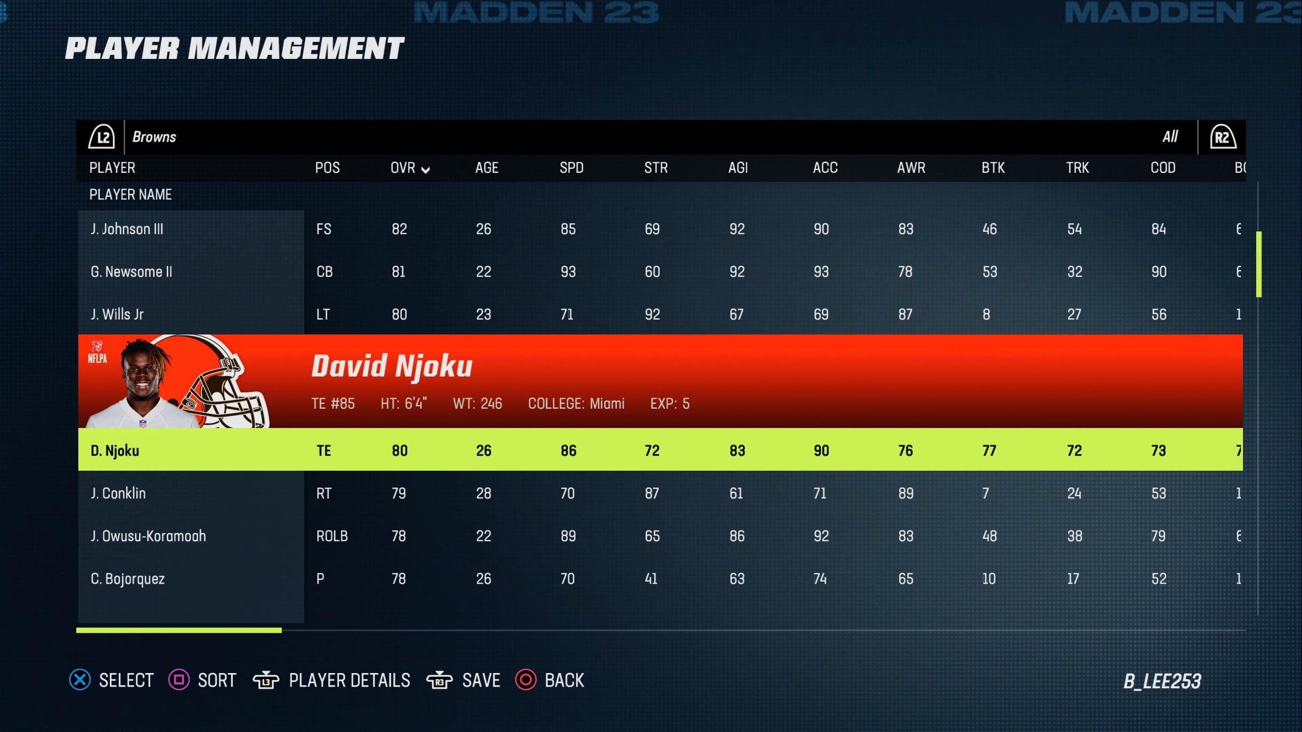 David Njoku(80 OVR)는 목록에 있는 유일한 타이트 엔드이지만 Cleveland 쿼터백 딜레마가 최소 Madden 23에 있는 지금 자신을 패스 캐치 타이트 엔드로 더욱 확립해야 합니다. 쿼터백 Deshaun Watson은 이제 공식적으로 정지된 반면 2022 시즌의 처음 11 게임 동안 Madden에서 Watson을 쿼터백으로 사용하여 프랜차이즈를 시작하여 Njoku에게 축구를 패스할 유능한 쿼터백을 제공할 수 있습니다. Njoku는 타이트한 끝에서 높은 평가를 받은 86 스피드로 그의 대의를 도울 것입니다.
