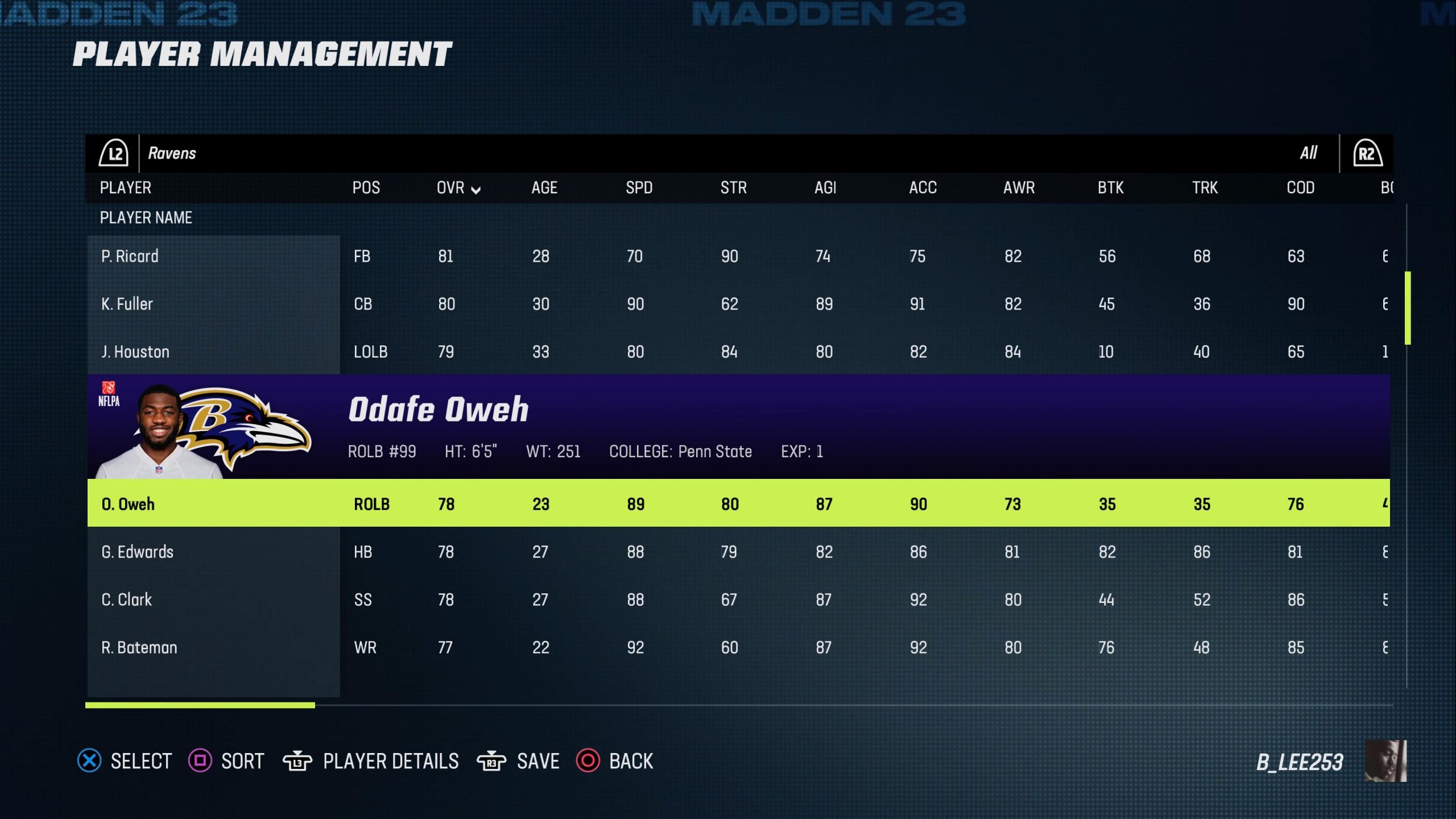 2년차 라인배커 Odafe Oweh(78 OVR)는 오른쪽 아웃사이드 라인배커로 선발로 확고히 자리를 잡았으며 또 다른 튼튼한 볼티모어 수비수로 리그에 진출하기 위해 노력할 것입니다. Oweh는 키가 6’5인치이고 체중이 251파운드로 인상적인 신체적 특성을 가지고 있습니다. 그는 89의 높은 속도 등급을 가지고 있습니다. 즉, 그를 지나쳐 날아가는 것을 거의 두려워하지 않고 엔드와 일부 와이드 아웃 또는 구역에 커버할 수 있습니다.