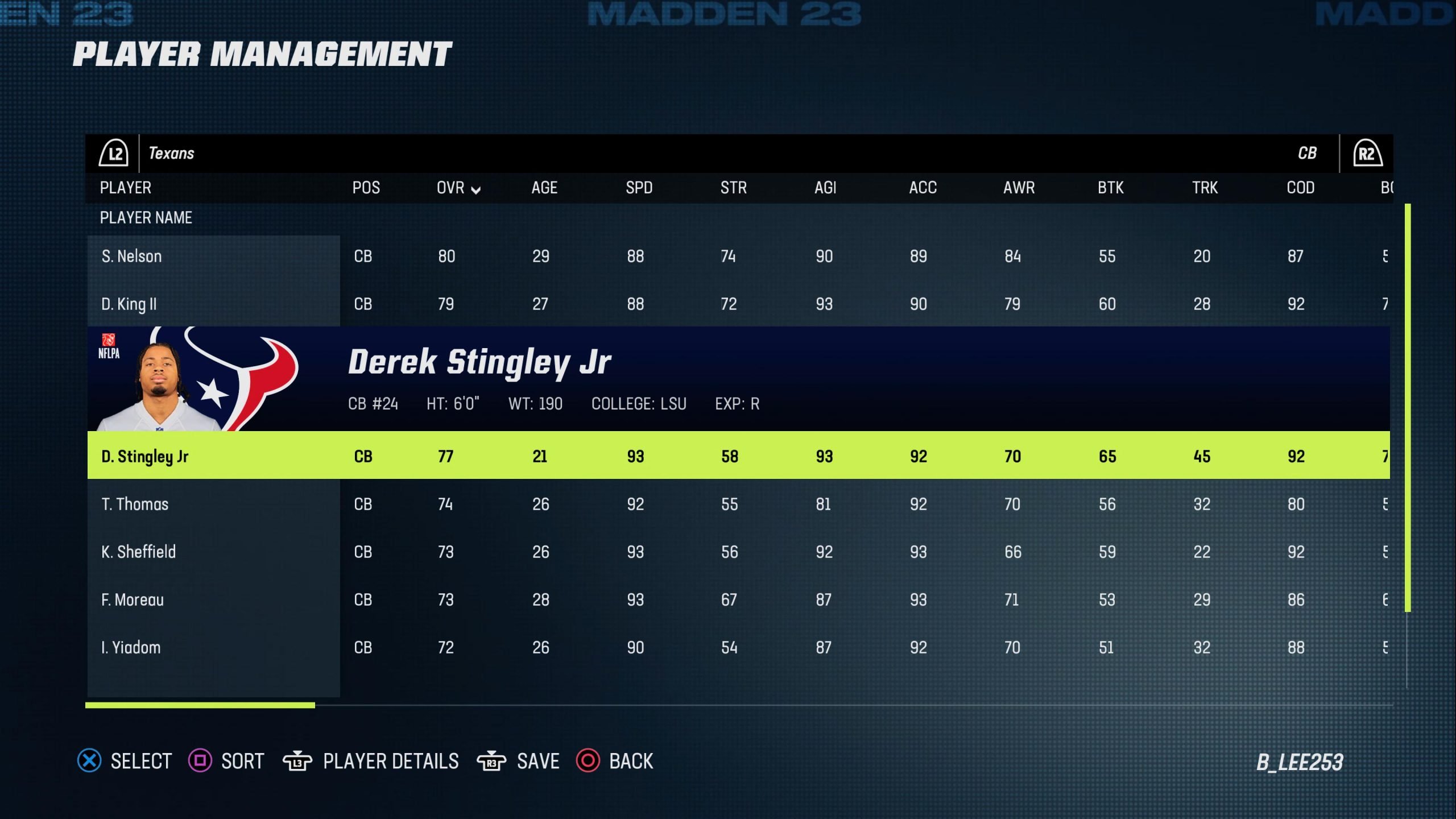 목록에 있는 유일한 신인 코너백 Derek Stingley, Jr.(77 OVR)는 휴스턴의 시즌이 끝나기 전에 CB1이 될 수 있어 팀에 큰 도움이 됩니다. 3세대 프로 축구 선수인 Stingley, Jr.는 Watson 사가에 휘말린 휴스턴 팀에 합류하여 이제 확고한 재건에 나섰습니다. Stingley, Jr.는 리그에서 더 빠른 리시버를 커버할 수 있는 엘리트 스피드(93)를 보유하고 있으며 팀(그리고 선택한 팀이라면 휴스턴)의 셧다운 코너가 되어야 합니다.