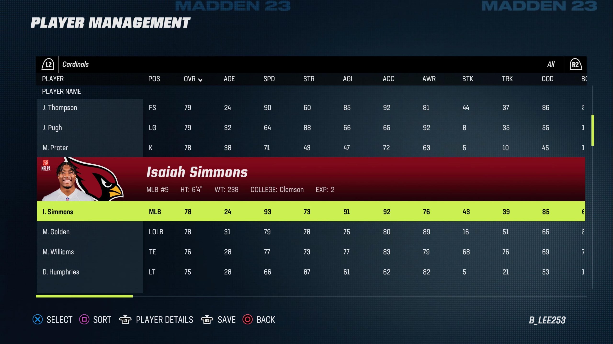 미들 라인배커 이사야 시몬스(78 OVR)는 애리조나의 3-4 스킴에서 내부 라인배커 중 한 명이지만, 3년차 선수는 Madden에서 돌파할 태세를 갖추고 있습니다. 그는 좋은 사이드라인 투 사이드라인 능력을 가지고 있으며 그의 93 스피드는 그를 Oweh보다 커버리지에 더 적합하게 만듭니다. 그는 JJ Watt와 Budda Baker를 포함하는 수비의 백본이 되기를 희망합니다.