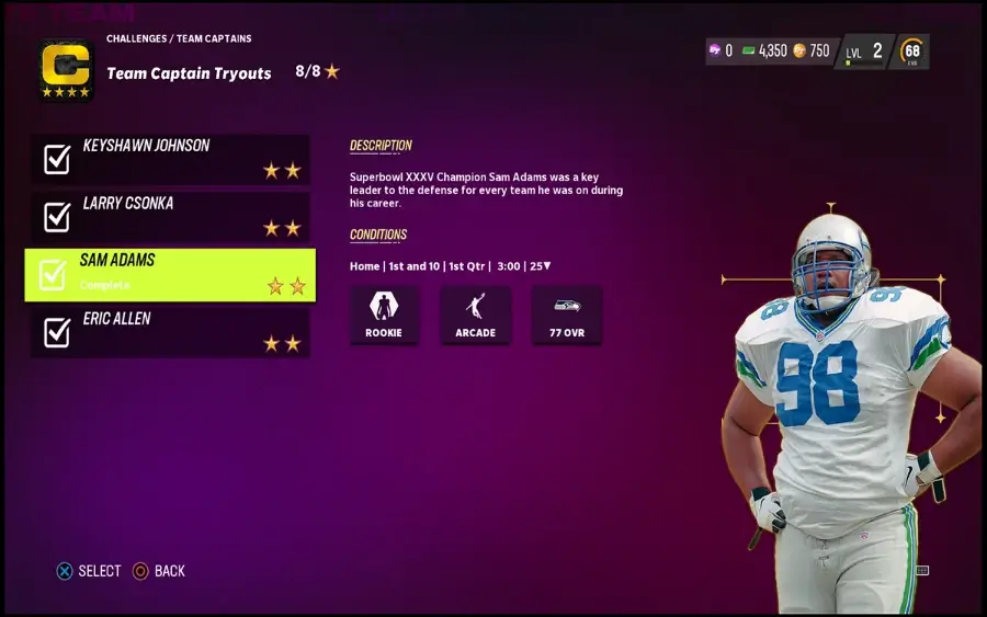 Superbowl XXXV 챔피언 Sam Adams는 6개의 다른 팀(Seattle, Baltimore, Oakland, Buffalo, Cincinnati, Denver)에서 뛰었으며 모든 팀의 수비에서 핵심 리더였습니다. 그는 프로 경력 동안 206경기를 뛰었고 총 태클 398개, 자루 44개, 가로채기 3개를 기록했습니다.