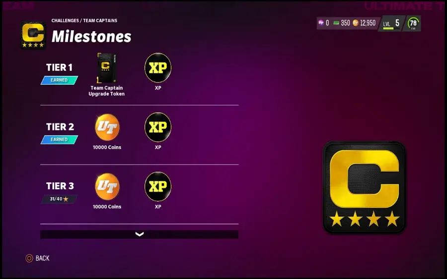 모든 팀 캡틴은 전체 등급이 85로 시작합니다. 업그레이드하려면 훈련 포인트와 업그레이드 토큰이 필요합니다. 팀 주장 챌린지를 완료하고 Tier 4에 도달하면 업그레이드 토큰 2개를 얻게 됩니다. 훈련 포인트는 로스터에서 솔로 챌린지 및 퀵셀러 플레이어를 완료하여 얻을 수 있습니다. 모든 팀 캡틴은 99 OVR 등급에서 최대치입니다. 명단 변경이 필요할 때 팀 주장을 변경할 수도 있습니다. 현재 팀 캡틴에게서 업그레이드 토큰을 제거하고 팀 캡틴 교환을 사용하여 팀 캡틴 판타지 팩을 받고 사용 가능한 다른 4명의 플레이어 중 한 명을 선택하십시오.