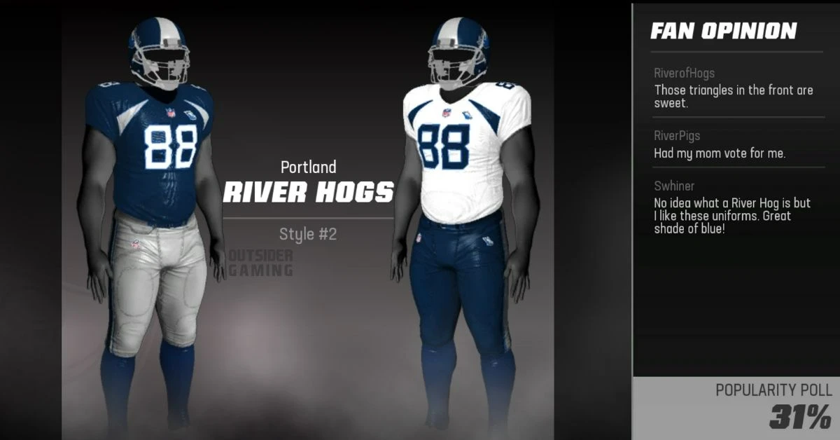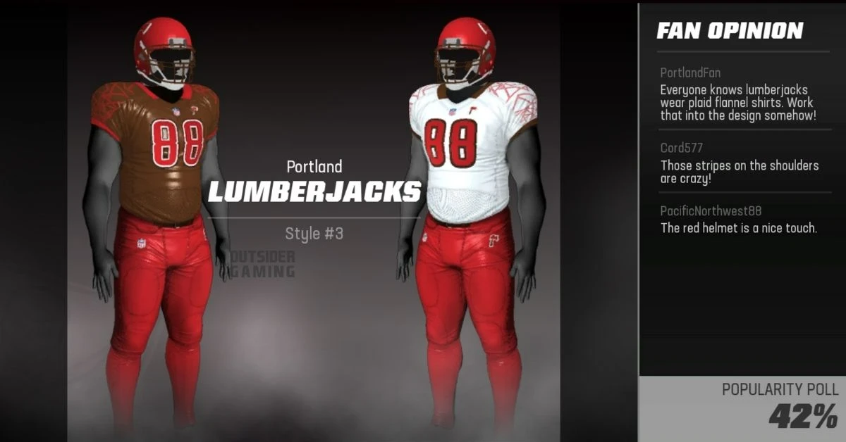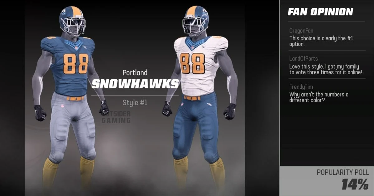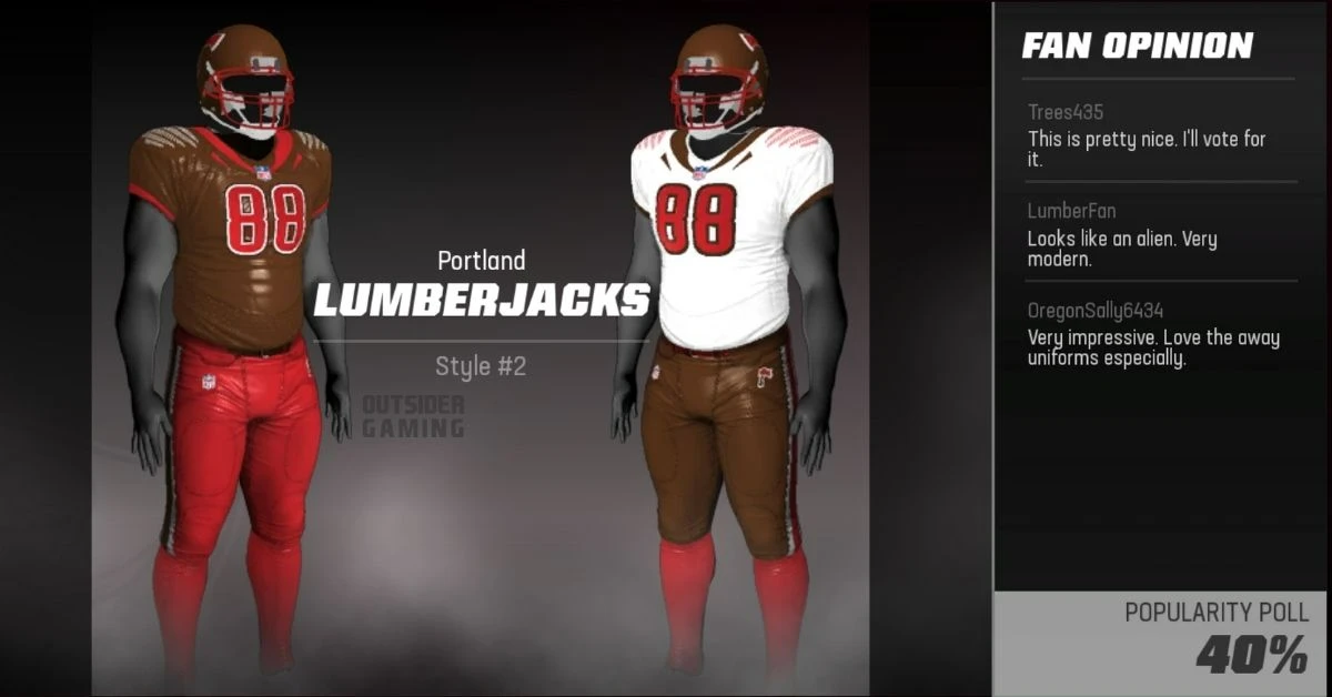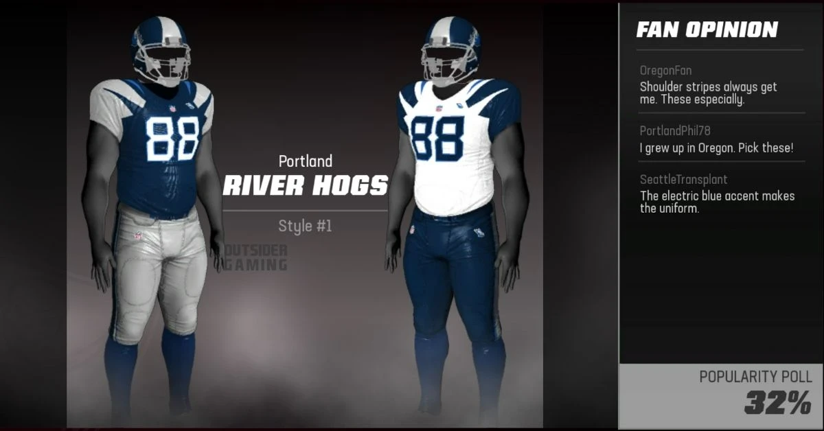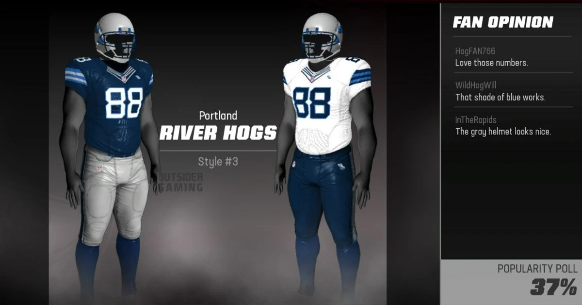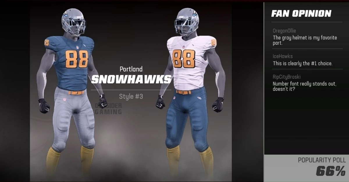 Madden 23의 Portland Lumberjacks, River Hogs 및 Snowhawks의 모든 포틀랜드 재배치 유니폼, 팀 및 로고가 있습니다.
