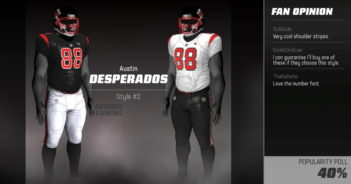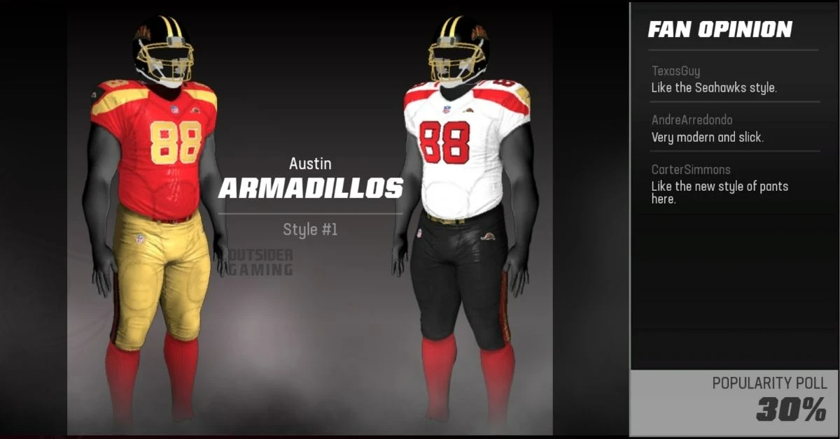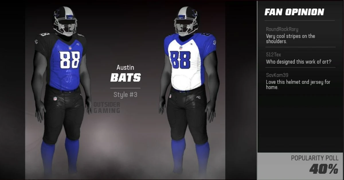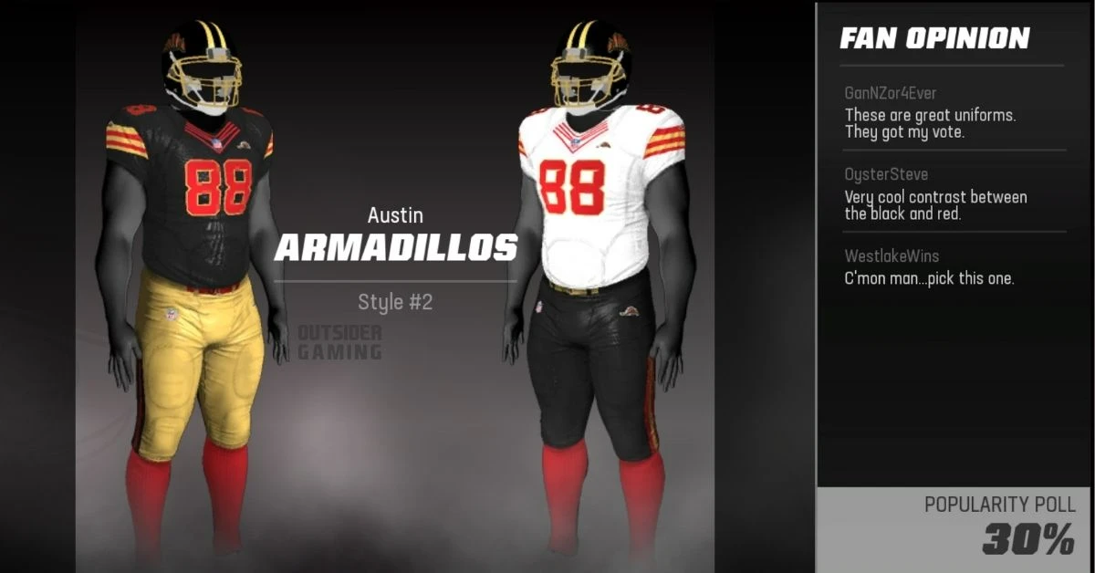 Madden 23의 Austin Armadillos, Bats and Desperados를 위한 모든 Austin 재배치 유니폼, 팀 및 로고가 있습니다.