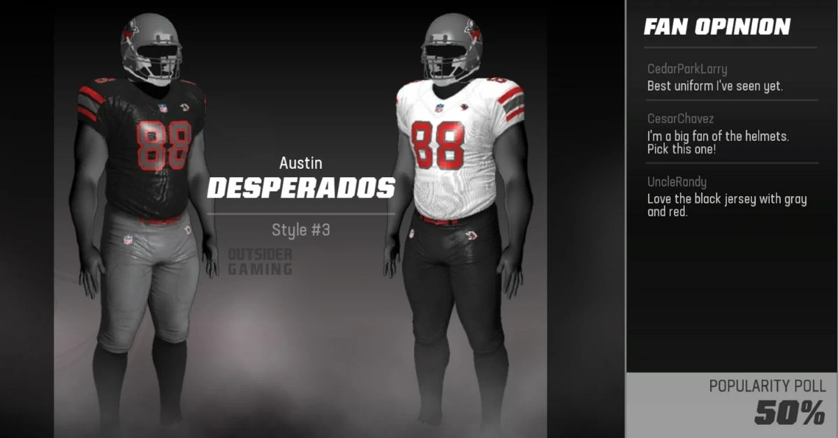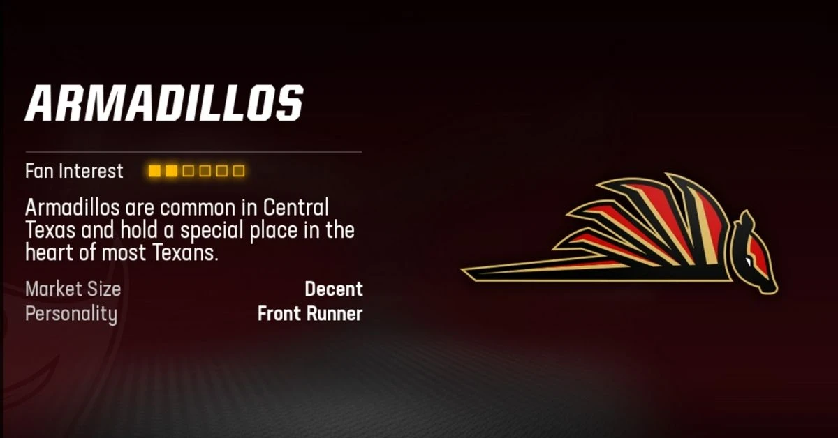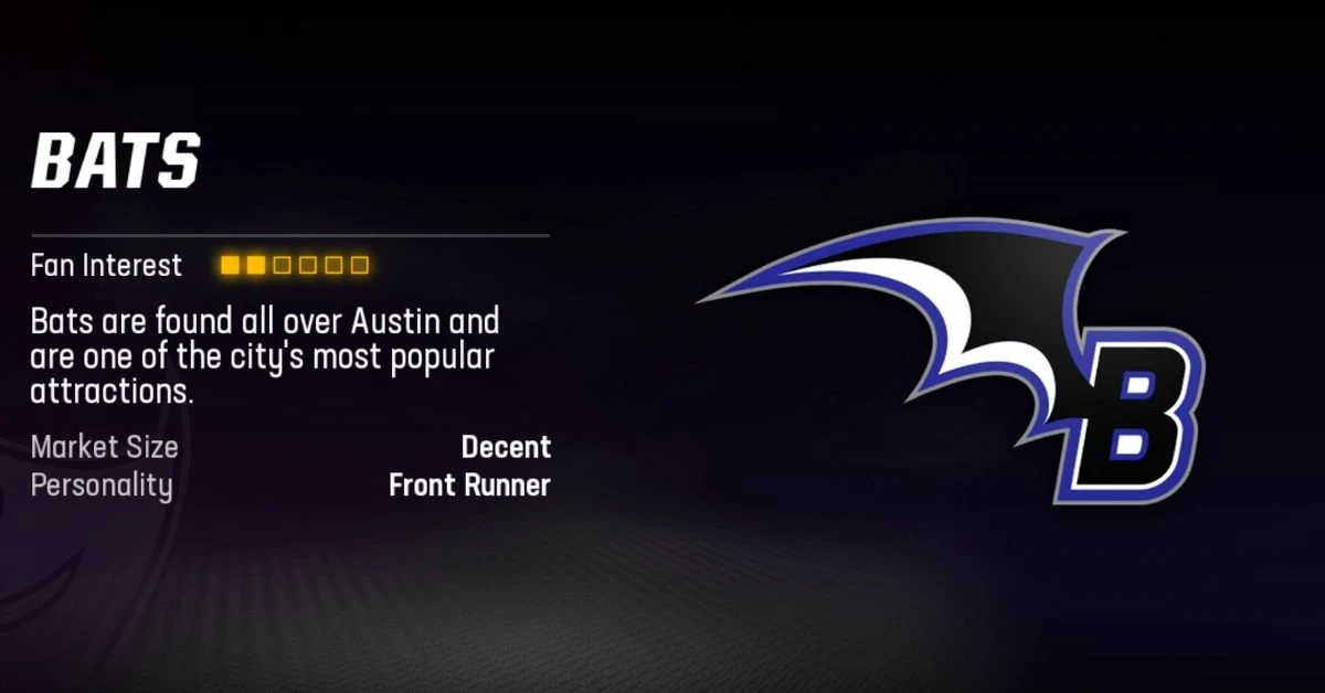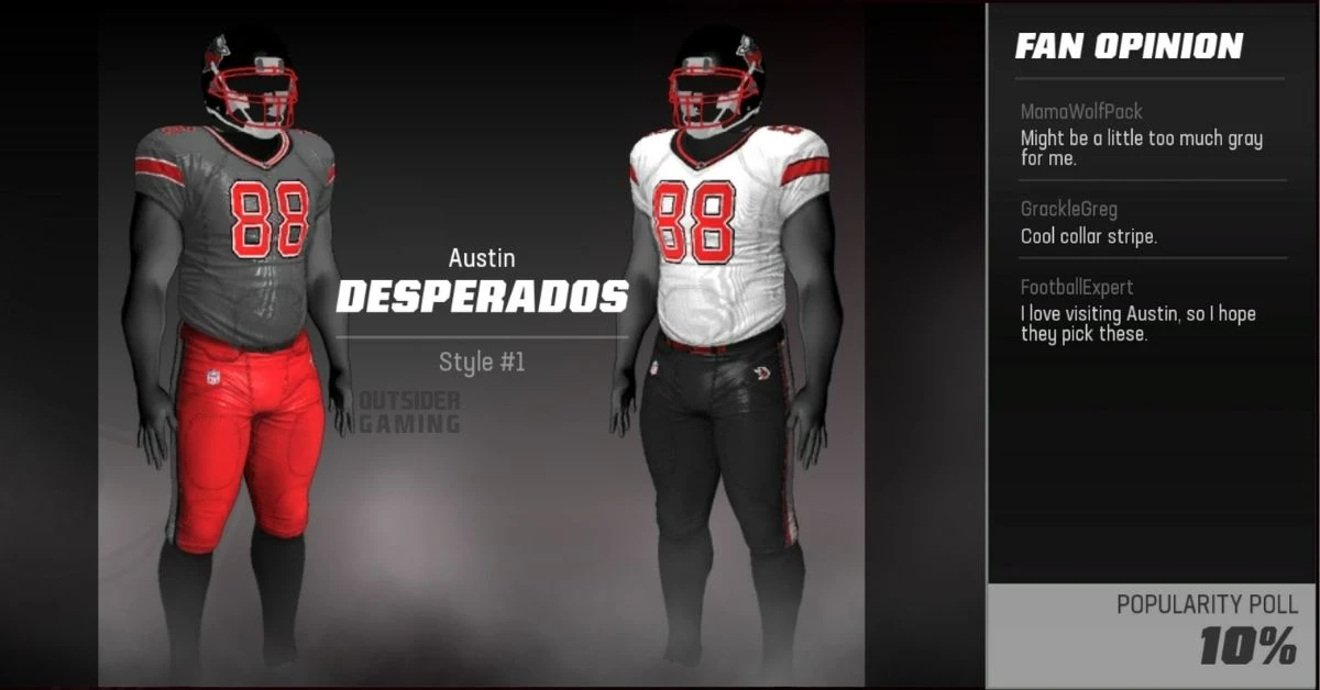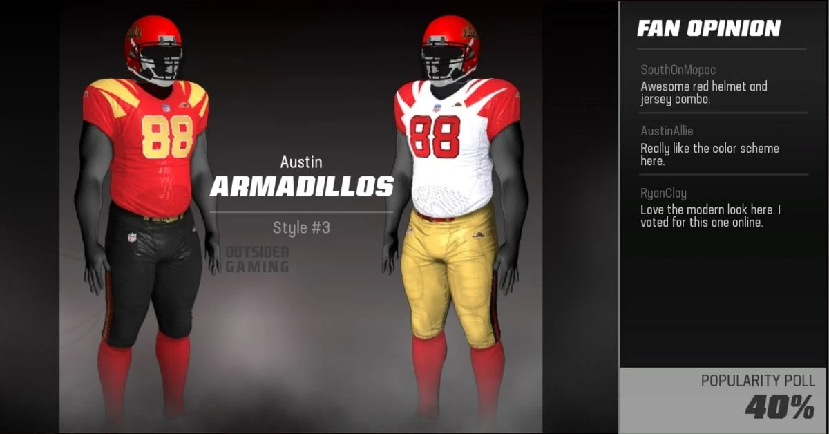 Madden 23의 Austin Armadillos, Bats and Desperados를 위한 모든 Austin 재배치 유니폼, 팀 및 로고가 있습니다.