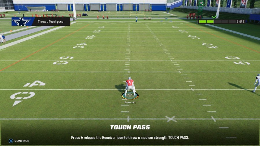 리시버 아이콘을 눌렀다가 놓아 중간 강도의 터치 패스를 던집니다. 터치 패스는 아래 수비수의 머리 위로 또는 더 깊은 커버리지 앞에서 공을 떨어뜨리는 데 사용되는 중간 강도의 패스입니다.