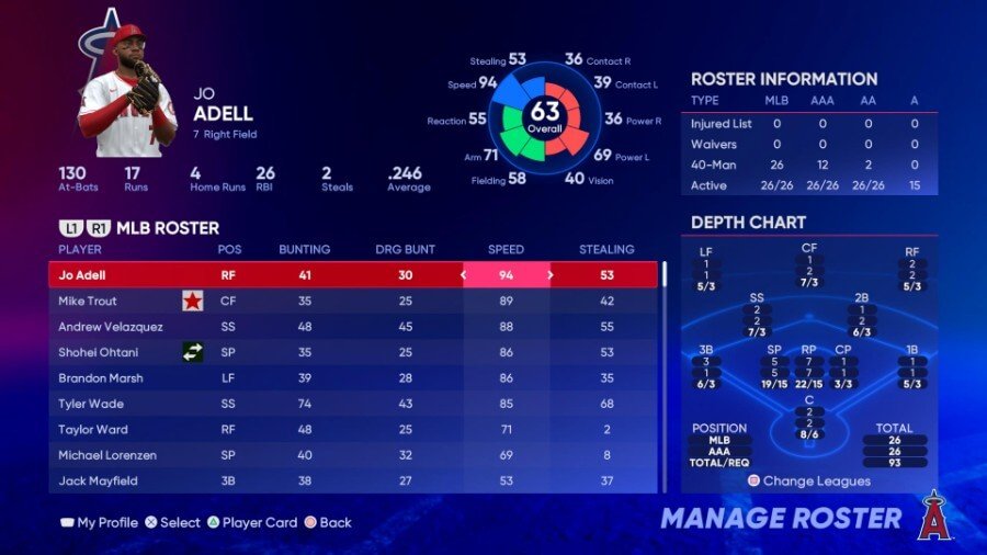 가장 빠른 선수: 조 아델(94단), 마이크 트라웃(89단), 앤드류 벨라스케즈(88단)