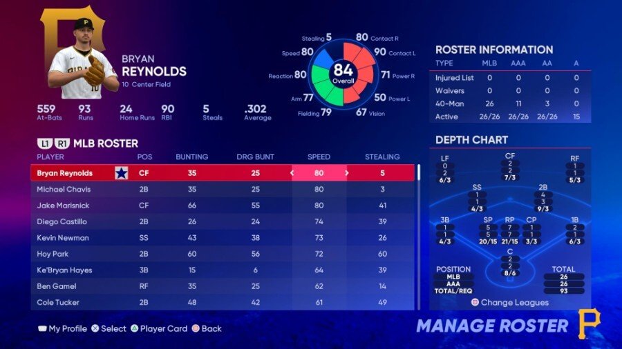 시즌에 걸친 재구축을 진행 중인 팀인 Pittsburgh는 Andrew McCutchen이 떠난 이후 첫 번째 진정한 경쟁자를 만들려고 하므로 최소한 많은 속도와 젊음을 구축할 수 있습니다. Reynolds는 Michael Chavis와 Jake Marisnick을 포함하여 80 스피드로 3명의 플레이어를 이끌고 있습니다. 디에고 카스티요(74), 케빈 뉴먼(73), 호이 박(72)이 70 스피드 이상을 완성했다. 3루수 Ke’Bryan Hayes(64)는 Ben Gamel(62)과 Cole Tucker(61)와 함께 60 스피드 이상에서 마지막으로 디비전 라이벌 Nolan Arenado를 제치고 최고의 수비 3루수로 꼽히는 선수입니다. 유일한 문제는 Pittsburgh의 MLB 명단에 60 이상의 스틸 등급이 있는 사람이 없습니다.. 이로 인해 속도를 최대한 활용하기가 더 어려워집니다.