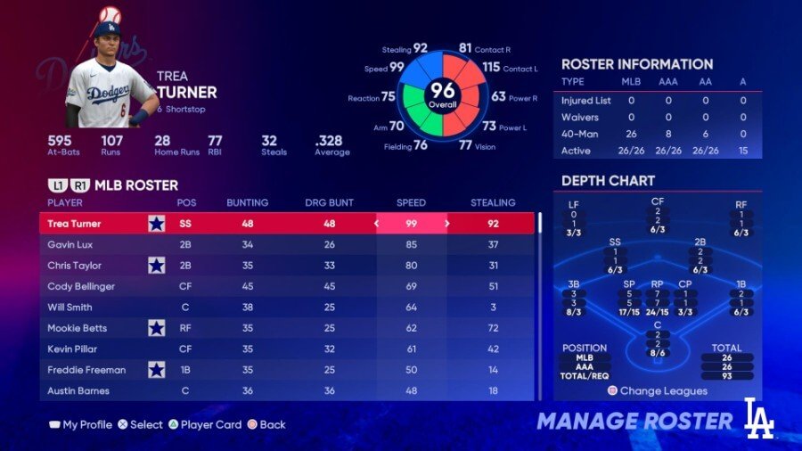 다저스에는 3명의 빠른 선수가 있고 그 다음 4명의 평균 이상의 속도를 가진 선수가 있습니다. 트레 터너는 The Show 22 99 Speed의 5명 중 한 명 메이저리그 로스터에. 6위인 Derek HIll은 시즌 중에 디트로이트에 합류할 가능성이 높으며 7위인 故 Lou Brock은 전설적인 선수입니다. Turner는 또한 92 Steal 등급을 가진 능숙한 도루입니다. 2루수 Gavin Lux(85)는 Turner와 빠른 키스톤 콤보를 형성합니다. 다재다능한 Chris Taylor(80)는 다이아몬드 전체에서 뛸 수 있는 반면 Cody Bellinger(69)는 평균 이상의 속도를 그의 탁월한 수비 등급에 제공합니다. 윌 스미스(64)는 발이 조금 더 빠른 또 다른 포수이고 무키 베츠(62)는 외야를 마무리하는 데 도움이 된다.