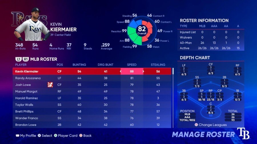 그들의 수비와 마찬가지로 탬파베이의 스피드는 외야에 있다. Kevin Kiermaier(88)는 최소 76의 속도를 가진 8명의 선수 중 한 명으로 선두를 달리고 있습니다. 그는 Randy Arozarena(81), Josh Lowe(79), Manuel Margot(78), 해롤드 라미레즈(78), 브렛 필립스(77). Taylor Walls(78)와 Wander Franco(76)는 유격수 포지션에 좋은 스피드를 제공하고, 신속성을 원한다면 2루수에 Walls를 제공합니다. Brandon Lowe는 60 스피드로 등장하여 50 이상의 플레이어를 반올림합니다.