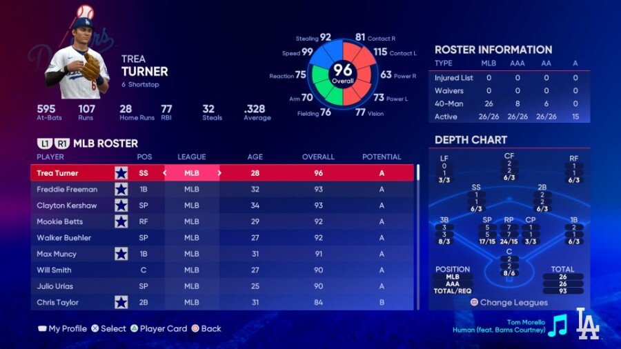 주목할만한 타자: 트레 터너(94 OVR), 프레디 프리먼(93 OVR), 무키 베츠(92 OVR)