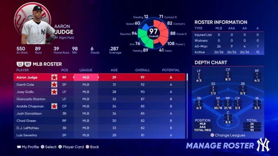 주목할만한 타자: 아론 저지(97 OVR), 조이 갈로(90 OVR), 지안카를로 스탠튼(87 OVR)