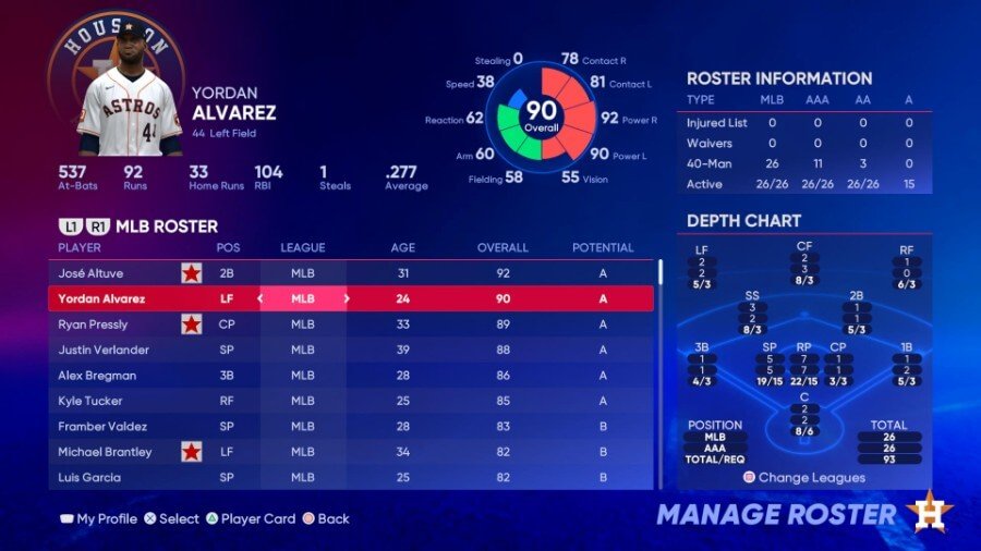 주목할만한 타자: 호세 알투베(92 OVR), 요르단 알바레즈(90 OVR), 카일 터커(85 OVR)