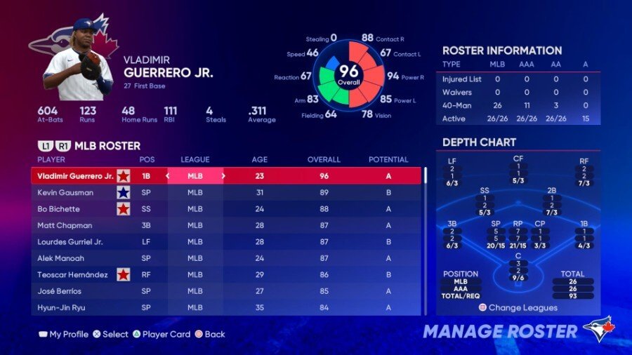 주목할만한 타자: 블라디미르 게레로 주니어(OVR 96), 보 비셰트(OVR 88), 테오스카 에르난데스(OVR 86)