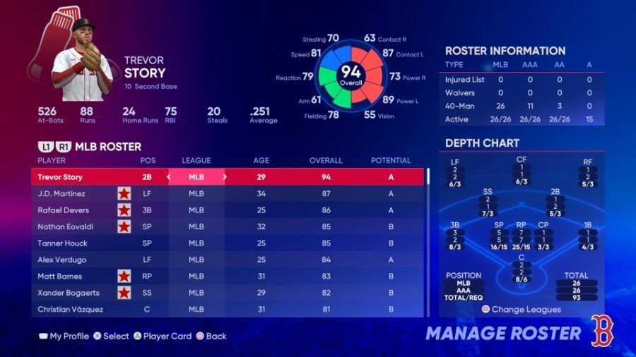 주목할만한 타자: 트레버 스토리(94 OVR), JD 마르티네즈(87 OVR), 라파엘 데버스(86 OVR)