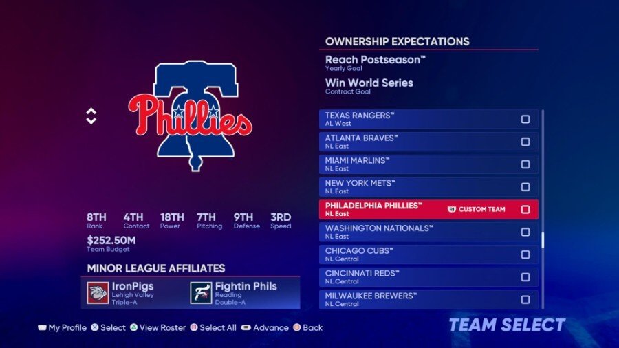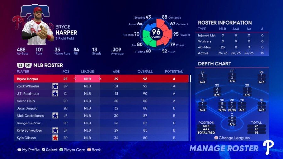 주목할만한 타자: 브라이스 하퍼(96 OVR), JT 리얼무토(90 OVR), 카일 슈워버(85 OVR)