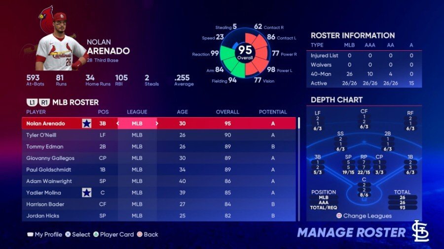 주목할만한 타자: 놀란 아레나도(95 OVR), 타일러 오닐(90 OVR), 토미 에드먼(89 OVR)