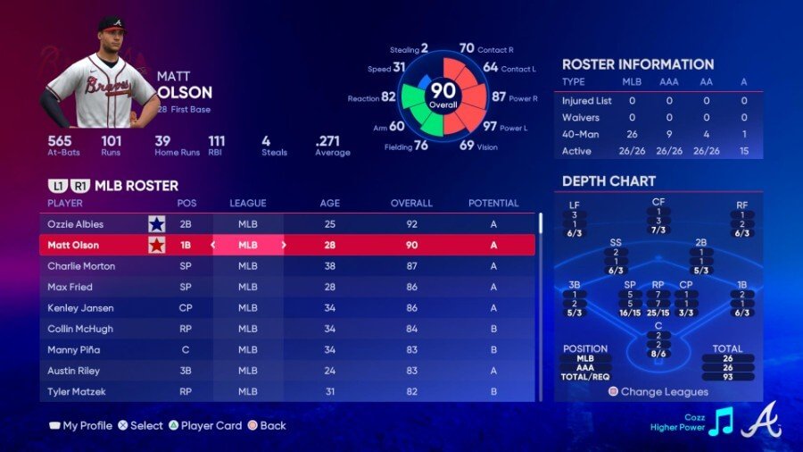 주목할만한 타자: 오지 알비스(92 OVR), 맷 올슨(90 OVR), 오스틴 라일리(83 OVR)