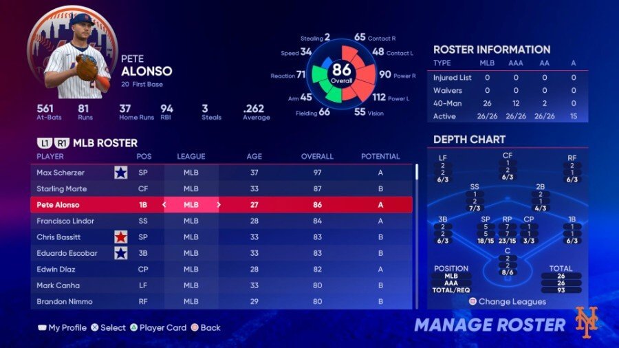 주목할만한 타자: 스탈링 마르테(87 OVR), 피트 알론소(86 OVR), 프란시스코 린도르(84 OVR)