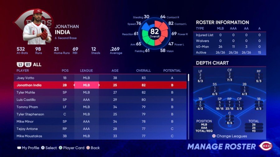 Tyler Mahle(82 OVR)와 Luis Castillo(80 OVR)는 특히 Castillo가 트레이드 블록에 있다는 소문이 있기 때문에 현재 로테이션을 이끌고 있습니다. Tejay Antone은 훌륭한 릴리버이지만 77 OVR에서 최고의 릴리버입니다. 80년대 선수들과 함께 로테이션과 불펜 업그레이드는 필수다. 오프닝 데이 명단을 만든 Nick Lodolo는 이러한 업그레이드 중 하나가 될 가능성이 있지만 문제는 얼마나 걸릴까요?