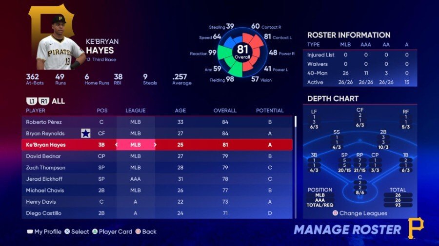 Pirates는 Bryan Reynolds와 Ke’Bryan Hayes(81 OVR)가 이끌고 있습니다. 레이놀즈는 중견수로서 필수적인 공격과 수비를 할 수 있다. Hayes는 Nolan Arenado가 아닌 최고의 수비 3루수로 간주되며 일부 전문가들은 Hayes가 이미 Arenado를 능가했다고 생각합니다. 로베르토 페레즈는 포수에서 자신의 능력을 돕습니다.