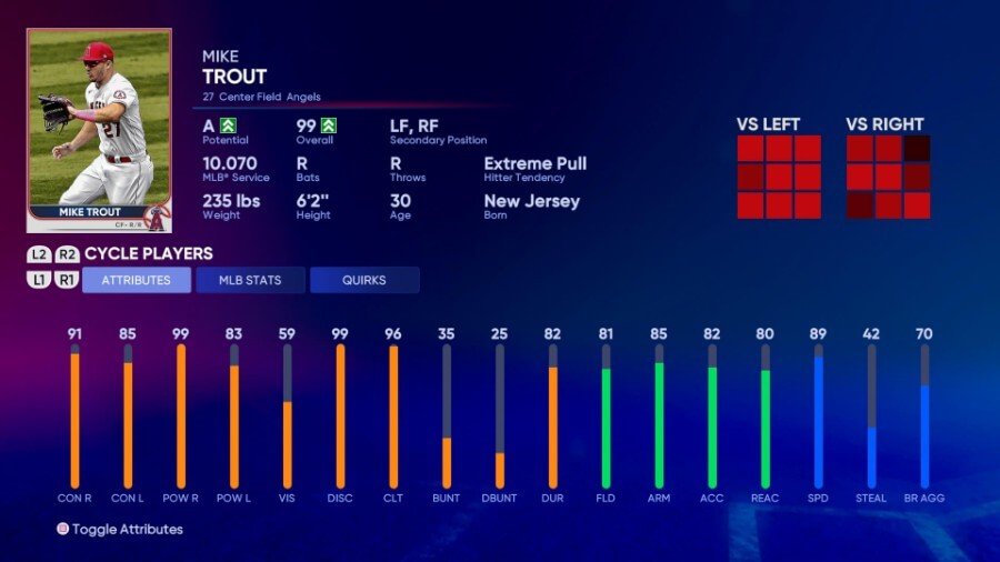 트라웃의 내구도(82)는 2021년 종아리 근육이 찢어질 때까지 최근 시즌에 더 많은 잔소리 부상과 싸웠기 때문에 약간 낮습니다. 그러나 그는 컨택(91 오른쪽 및 85 왼쪽)과 파워(99 오른쪽 및 83 왼쪽)를 위해 칠 수 있습니다. 빠른 속도(89)와 전반적으로 견고한 수비로 적어도 한 시즌 동안 우익수로 이적한다는 대화를 막을 수 있습니다.