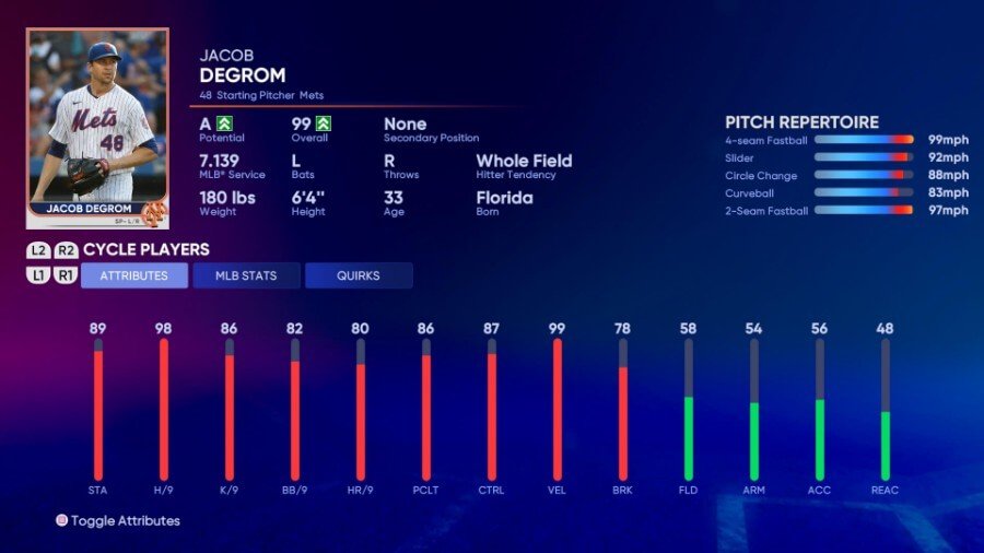 최고 등급: 99 벨로시티, 9이닝당 98 안타, 89 스태미나