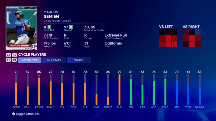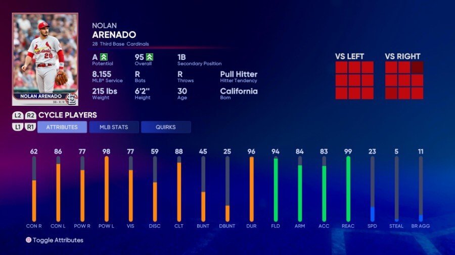 그는 플레이트 비전(41)이 낮을 수 있지만 타율 전반에 걸쳐 견고하고 놀라운 스탯으로 이를 만회합니다. 그의 수비력도 Arm Strength(76)가 약간 낮지만 좋은 평가라는 점에서 반영됩니다.
