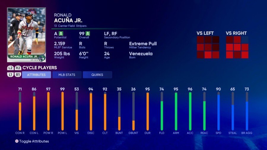 Acuña, Jr.는 이 목록에 있는 몇몇 선수들도 소유하고 있는 드문 속도와 힘의 조합입니다. 그의 속도는 90이고 정확하고 강력한 암파워(95)로 가장 큰 외야도 쉽게 다룰 수 있으며 주자는 추가 베이스나 태깅에 대해 두 번 생각하게 합니다. 그의 내구도(95)는 부상에도 불구하고 여전히 높다. 왜냐하면 찢어진 ACL이 그의 젊은 경력에서 지금까지 유일한 주요 부상이기 때문이다.