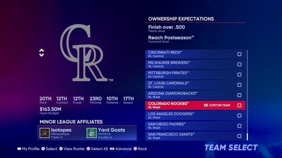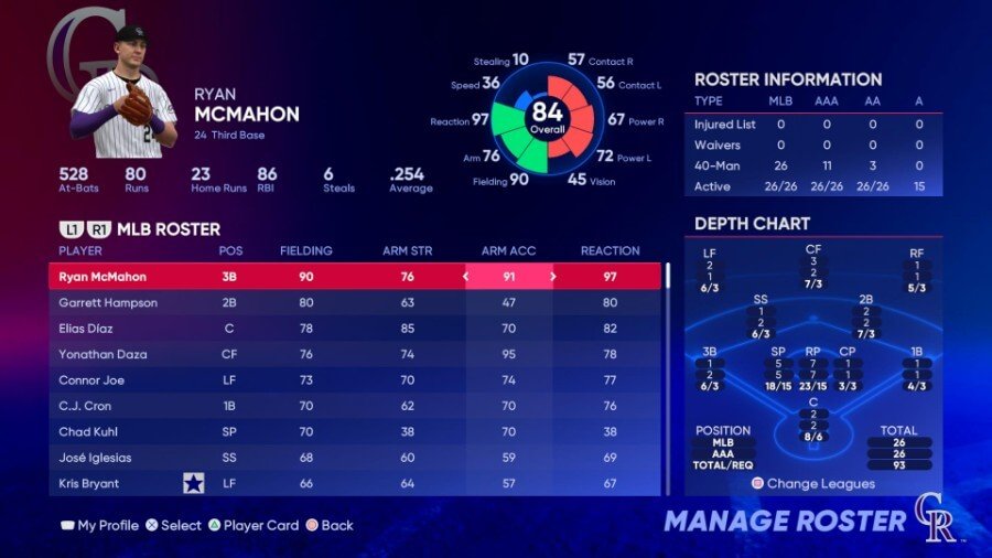 주목할만한 필더: Ryan McMahon(97 리액션), Garrett Hampson(80 Fielding), Elias Diaz(85 Arm Strength)