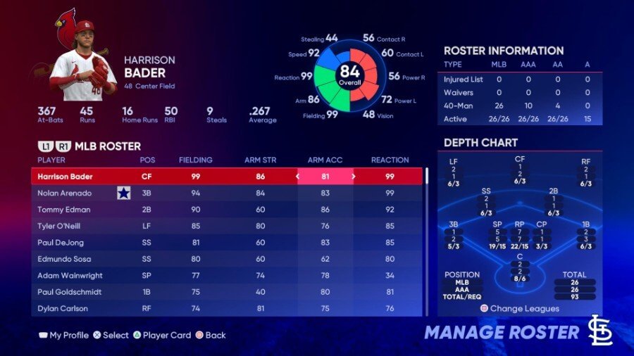 주목할만한 필더: 해리슨 베이더(99 필딩), 놀란 아레나도(99 리액션), 토미 에드먼(92 리액션)