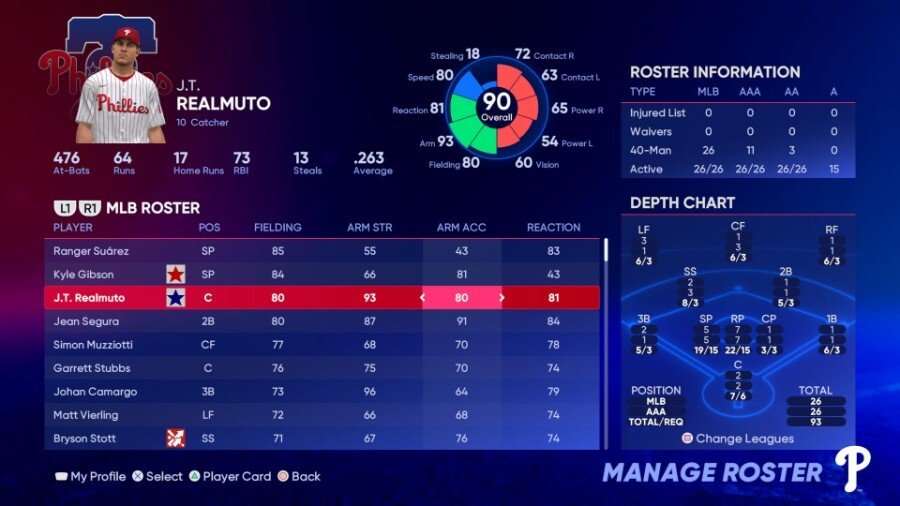 흥미롭게도 MLB The Show 22의 Fielding 등급을 기준으로 Phillies 최고의 두 선수는 투수입니다. 2019년 Gold Glove 수상자인 JT Realmuto는 포지션 플레이어로 이동하여 훌륭한 수비수이자 틀림없이 야구 최고의 포수입니다. 2루의 Jean Segura는 자신의 등급이 있는 Gold Glove 구경입니다. Bryce Harper는 약간 오른쪽으로 후퇴했지만 항상 그의 수비 콜 카드였던 강력하고 정확한 던지는 팔을 유지했습니다. Simon Muzziotti와 Garrett Stubbs는 플레이 시간을 그렇게 많이 보지는 않지만 볼 수 있는 것은 수비 때문입니다. 전 애틀랜타의 요한 카마르고(Johan Camargo)는 3루에서 평균 이상의 수비 등급에 믿을 수 없을 정도로 강력한 팔을 제공합니다.