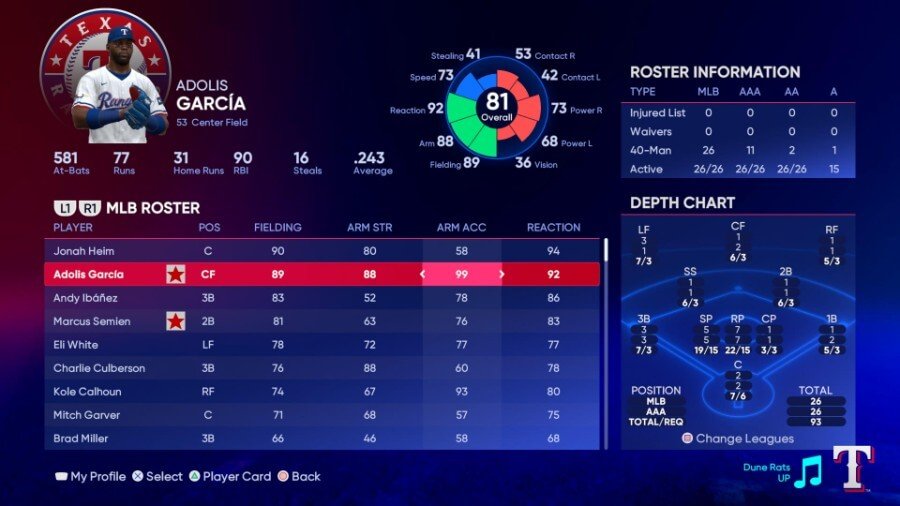 Corey Seager와 텍사스주 Marcus Semien을 영입한 후 몇 년 동안 고군분투하고 턴어라운드를 시작하기를 희망하는 젊은 팀은 끊임없이 비난받는 투수진을 돕기 위해 최소한 상위 5위의 수비력(및 타격력)을 가지고 있습니다. Jonah Heim은 포수에서 강력한 수비수이지만 그의 블로킹(59)은 더 높을 수 있습니다. 아돌리스 가르시아는 중견수 팔 정확도에서 완벽한 99를 포함하여 높은 수비 등급과 함께 평균 이상의 속도를 가지고 있습니다. Andy Ibáñez는 3루수에서 Adrián Beltre의 새로운 텍사스 버전이 되기를 희망하는 반면, Semien은 토론토와 그의 더블 플레이 파트너인 Seager를 위한 2021년 골드 글러브를 수상할 갓입니다. 최소한 적절한 수비수입니다. Charlie Culberson은 4개의 비포수 내야 포지션을 뛸 수 있으며 평균 이상의 수비수인 반면 Eli White는 평균 이상의 수비와 함께 게임에서 가장 빠른 선수 중 한 명입니다.
