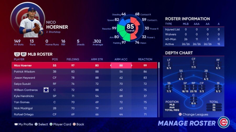 주목할만한 필더: Nico Hoerner(99 리액션), Patrick Wisdom(88 Arm Strength), Jason Heyward(88 Arm Strength)
