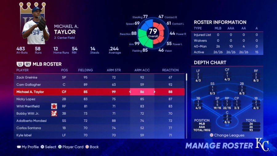 주목할만한 필더: Zack Greinke(95 Fielding), Cam Gallagher(92 Reaction), Michael A. Taylor(99 Arm Strength)
