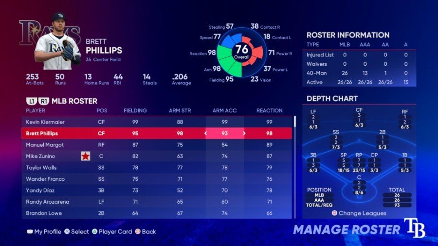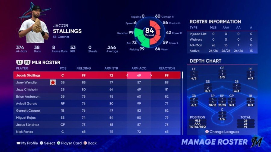 마이애미는 피츠버그와의 트레이드로 영입한 포수 제이콥 스탤링스라는 한 명의 선수를 추가함으로써 수비에 큰 도약을 보였습니다. Stallings는 2021년 자신의 직책에서 Gold Glove와 Fielding Bible 상을 모두 수상했으며 The Show 22에서 평가를 받았습니다. 그의 블로킹도 80점으로 뛰어나다. 다재다능한 수비수였던 전 레이 조이 웬들(Ray Joey Wendle)과 2루수에 흥미진진한 Jazz Chisholm, Jr.가 합류했다. 또 다른 다재다능한 수비수인 브라이언 앤더슨(Brian Anderson)은 강한 팔을 가지고 있으며(정확하지 않다면) 아비사일 가르시아와 헤수스 산체스가 외야수를 도맡아 하고 있습니다. Garrett Cooper는 1루에서 견고하지만 Arm Strength는 47입니다. 다시 말하지만, 1루수는 다른 내야수만큼 공을 던질 필요가 없습니다.