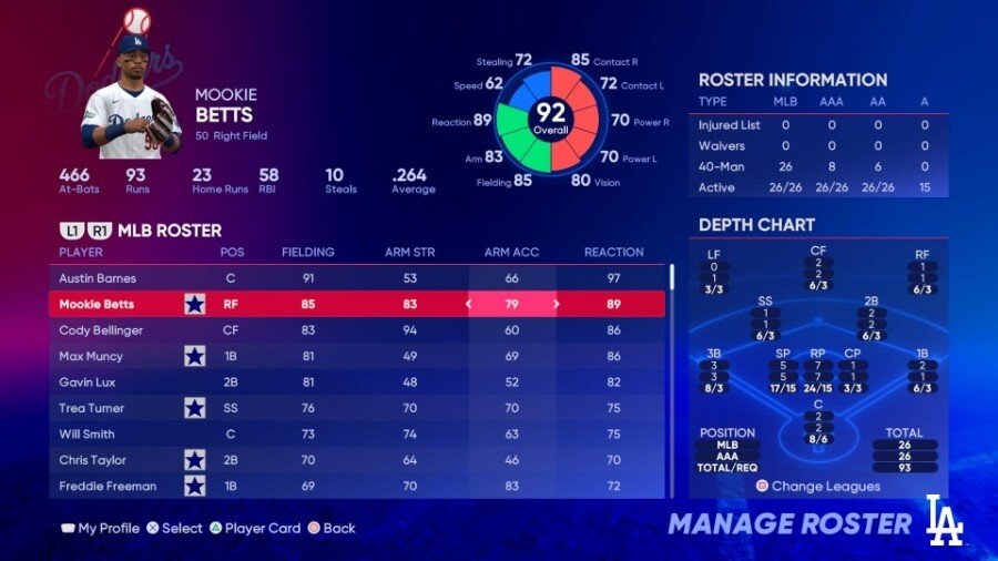 주목할만한 필더: 오스틴 반스(97 리액션), 무키 베츠(89 리액션), 코디 벨린저(94 팔 힘)
