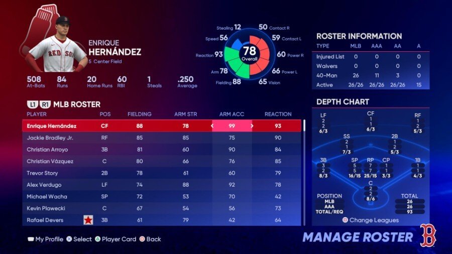 주목할만한 필더: Enrique Hernández(99 Arm 정확도), Jackie Bradley, Jr.(90 Reaction), Christian Arroyo(90 Arm 정확도)