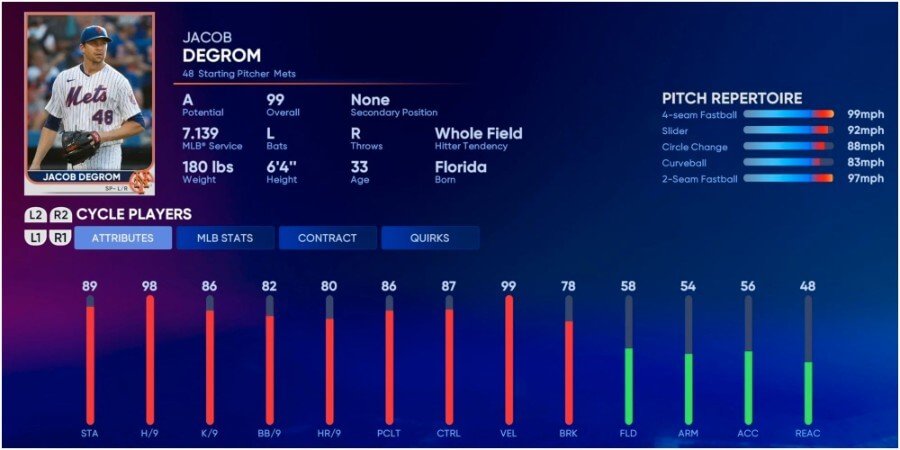 deGrom의 가장 낮은 속성은 78(Pitch Break)이지만 대부분이 80대 후반입니다. deGrom은 단순한 엘리트 투수가 아니라 1퍼센트 중 1퍼센트입니다. 뛰어난 투구 컨트롤(피치 컨트롤 87), 클러치 능력(피칭 클러치 86(피칭 클러치 86, 스태미너 89). 야구 최고의 투수 – 건강할 때, 현재 부상으로 인해 부상을 입었지만 2021년 디그롬은 7승 1패 평균자책점 1.08, 탈삼진 146개를 기록했다.