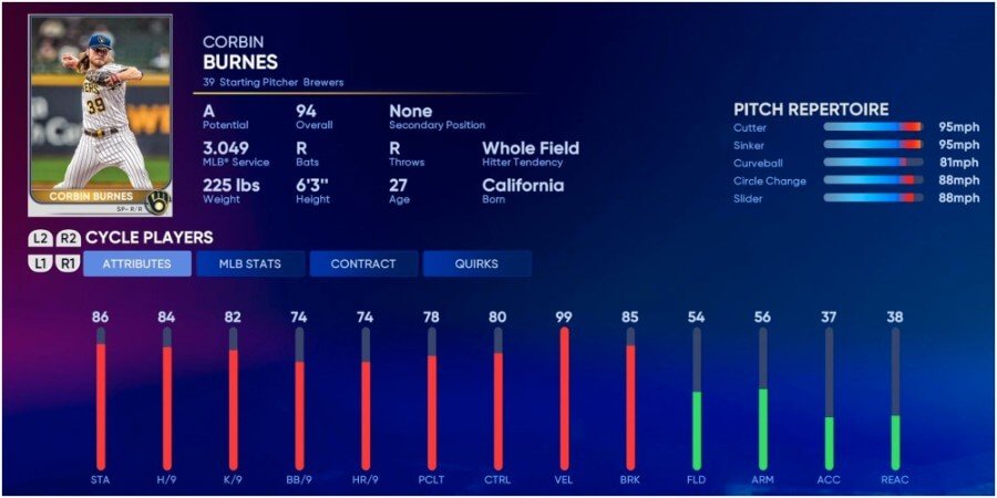 Corbin Burnes는 속도만 알고 있기 때문에 Sonic 2의 교차 프로모션 도구로 사용되어야 했습니다. 그의 모든 투구는 속보 및 오프스피드 투구를 포함하여 시속 80마일 이상입니다. 그는 85 Pitch Break 속성을 가지고 있으며 Pitch Control에서 80을 기록합니다. Burnes는 빠르고 교묘하며 권위 있는 공을 던집니다. 그는 Road to the Show에서도 Break 전형의 주요 플레이어입니다.