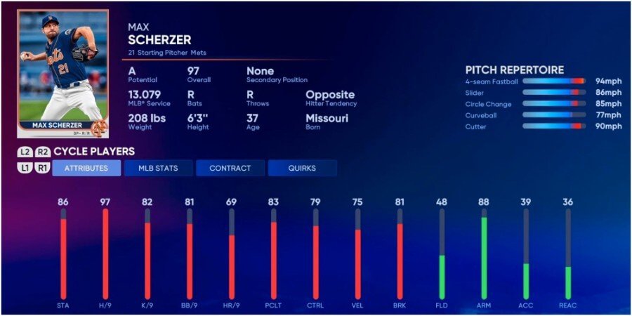 Scherzer의 86 스태미나는 그가 완전한 게임을 던질 수 있고 전체를 통해 엘리트 수준에서 플레이할 수 있음을 의미합니다. 그는 약점이 없고 대부분의 특성이 80점대를 기록하고 있어 그가 얼마나 완벽한 투수인지를 보여줍니다. 2021년 시즌 동안 셰르저는 15승 1패 평균자책점 2.46, 삼진 236탈삼진을 기록했다.
