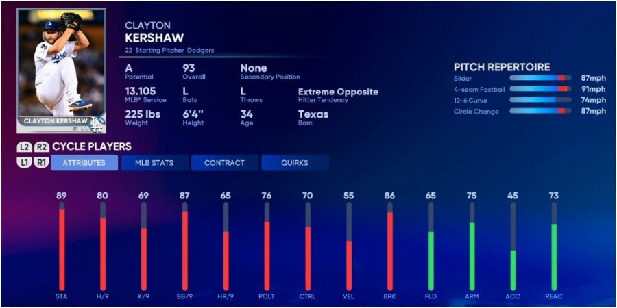 Kershaw가 타자들에게 무서운 이유는 그의 구질의 다양성입니다. 그는 네 가지 투구 유형을 가지고 있으며 모두 완전히 독특하므로 그가 던질 것을 예측하기가 어렵습니다. 평균 벨로시티 등급(55)을 가지고 있기 때문에 매우 빠르게 던지지는 않지만 평균 이상의 피치 컨트롤(70)과 엘리트 레벨 피치 브레이크(86)를 가지고 있습니다. 부상으로 최다 기록은 올리지 못했지만 10승 3.55 평균자책점 144탈삼진으로 시즌을 마감했다.