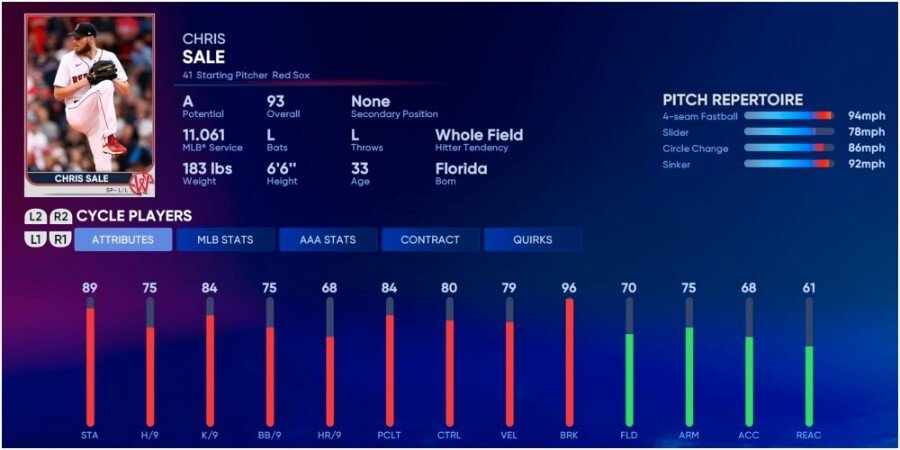 Chris Sale은 부상으로 고통받는 2021 시즌을 9경기만에 선발 출장했습니다. 건강할 때 그는 여전히 경기 최고의 투수 중 한 명이며 운 좋게도 MLB Show 22에서 매일 부상이 없는 날입니다. 그는 75세 미만(9이닝당 홈런 68개) 미만의 투구 속성을 하나만 가지고 있으며, 이는 그가 투수의 거의 모든 면에서 엘리트임을 보여줍니다.