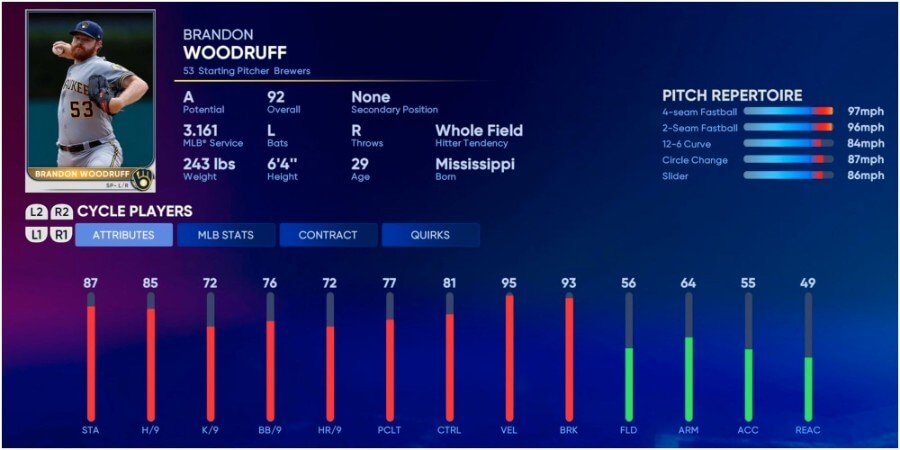 Woodruff는 87의 스태미나를 가지고 있으므로 밤에 당신의 에이스 투수가 될 수 있고 일찍 불펜으로부터 스트레스를 받을 수 있습니다. 그는 9이닝당 많은 안타와 볼넷을 허용하지 않으며(각각 85 및 76), 그의 9이닝당 삼진은 72로 평균 이상입니다. 2021 시즌에 Woodruff는 9승, 2.56의 평균자책점, 211개의 삼진을 기록했습니다.