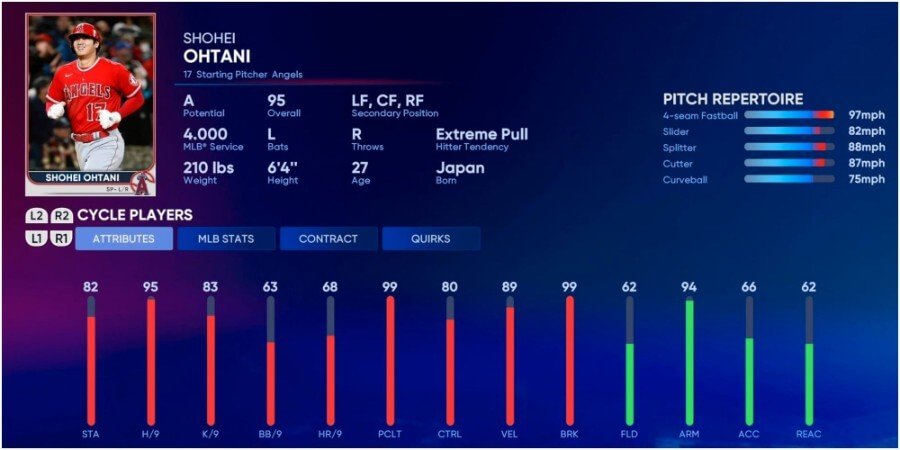 오타니는 90년대에 3가지 속성을 가지고 있습니다. 여기에는 피칭 클러치 및 피치 브레이크 카테고리를 99개로 최대화하는 것입니다. 그는 많은 사람들이 칠 수 없는 엄청난 97마일의 패스트볼을 던집니다. 이것이 그가 9이닝당 95개의 타수를 자랑하는 이유이기도 합니다. 그 문제에 대해 일반적으로 더 나은 양방향 선수나 야구 선수를 요청할 수 없습니다. 오타니는 9승 1패 평균자책점 3.18, 삼진 156개를 기록했다.