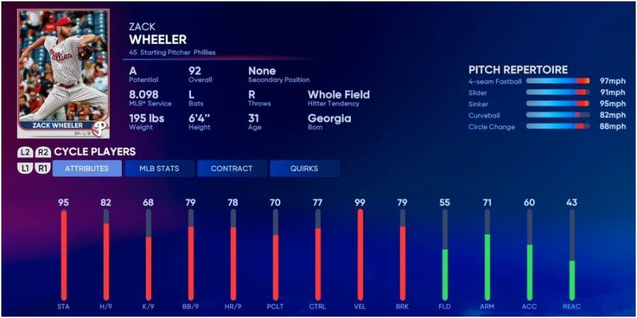 Zack Wheeler의 재능으로 인해 그는 대부분의 시간 동안 효과가 있는 전략을 세울 수 있습니다. 그 전술은 그가 할 수 있는 한 빨리 던지는 것입니다. 그는 99의 속도와 95의 체력이라는 놀라운 평가를 받았습니다. 그는 당신에게 볼이 깨지는 것을 볼 충분한 시간을 주지 않습니다.
