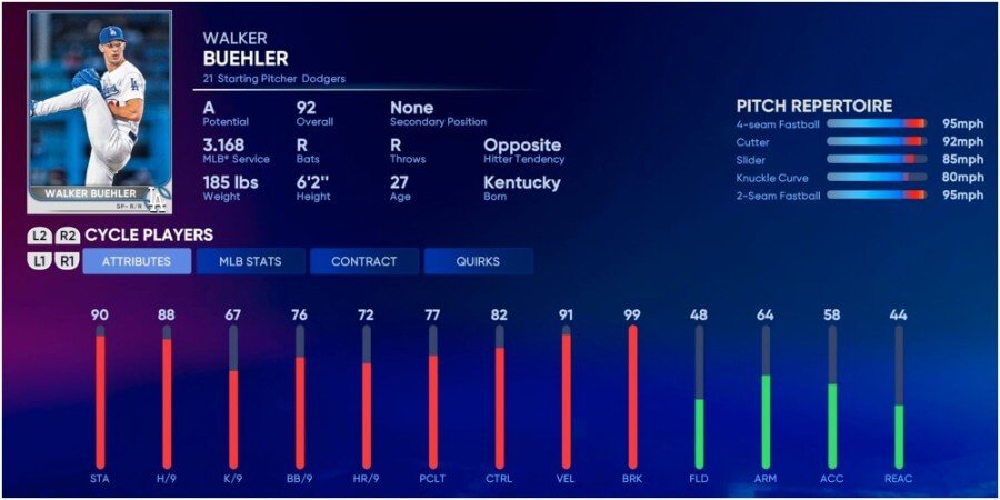 Walker Buehler는 로스앤젤레스 다저스가 2020년 월드 시리즈에서 우승하는 데 도움이 된 지 불과 2년 후인 2021년 올스타 시즌을 막 시작했습니다. Buehler는 투구 유형으로 커터, 슬라이더 및 너클 커브를 가지고 있으므로 99 피치 브레이크 등급은 그의 투구를 읽기가 거의 불가능합니다.