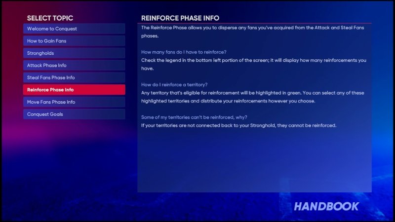Reinforce는 4단계 중 가장 전략적인 단계이므로 팬을 보내는 데에는 이유가 있어야 합니다. 이 단계에서 실수를 너무 많이 하면 다른 팀에 팬을 잃게 됩니다. 열쇠는 그들이 당신을 정복하기 전에 그들을 정복하는 것입니다. 공격 단계로 돌아가면 모든 손이 갑판에 있어야 합니다. 최전선이 전부입니다.