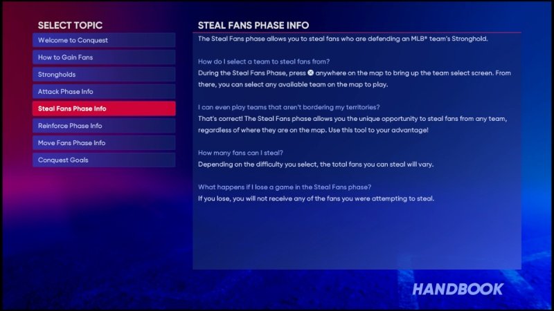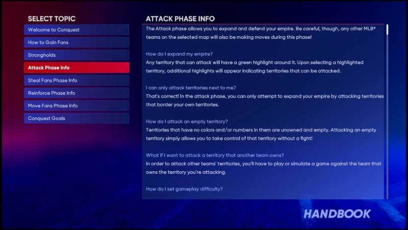 Conquest는 Diamond Dynasty의 솔로 게임 모드입니다. 팬을 확보하고, 이 팬으로 영토를 강화하고, 영토를 정복하여 각 맵을 완성하세요. 단일 지역이 보유할 수 있는 최대 팬 수는 9900만입니다. 각 지역은 팬을 훔치는 CPU에 대한 3이닝 게임을 나타냅니다. 하지만 요새를 제외한 모든 지역을 시뮬레이션할 수 있습니다(자세한 내용은 아래 참조). Conquest 모드에는 Attack, Steal, Reinforce, Move의 4단계가 있습니다.